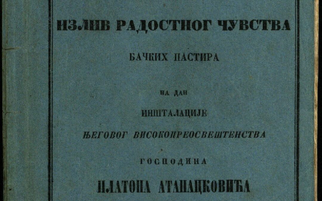 ПОПОВИЋ, Аца Зуб Пастирска игра или Излив радостног чувства бачких пастира на дан иншталације његовог високопреосвештенства господина Платона Атанацковића за дијецезана Епархије бачке / Саставио Аца Поповић. - У Новом Саду : Народна Књигопечатња Др. Дан. Медаковића, 1852. - [4], 60 стр. ; 19 cm. Новаковић 1800; Кириловић 1589; КНБС 2023; Српске штампане књиге БМС 1801-1867, 3540.