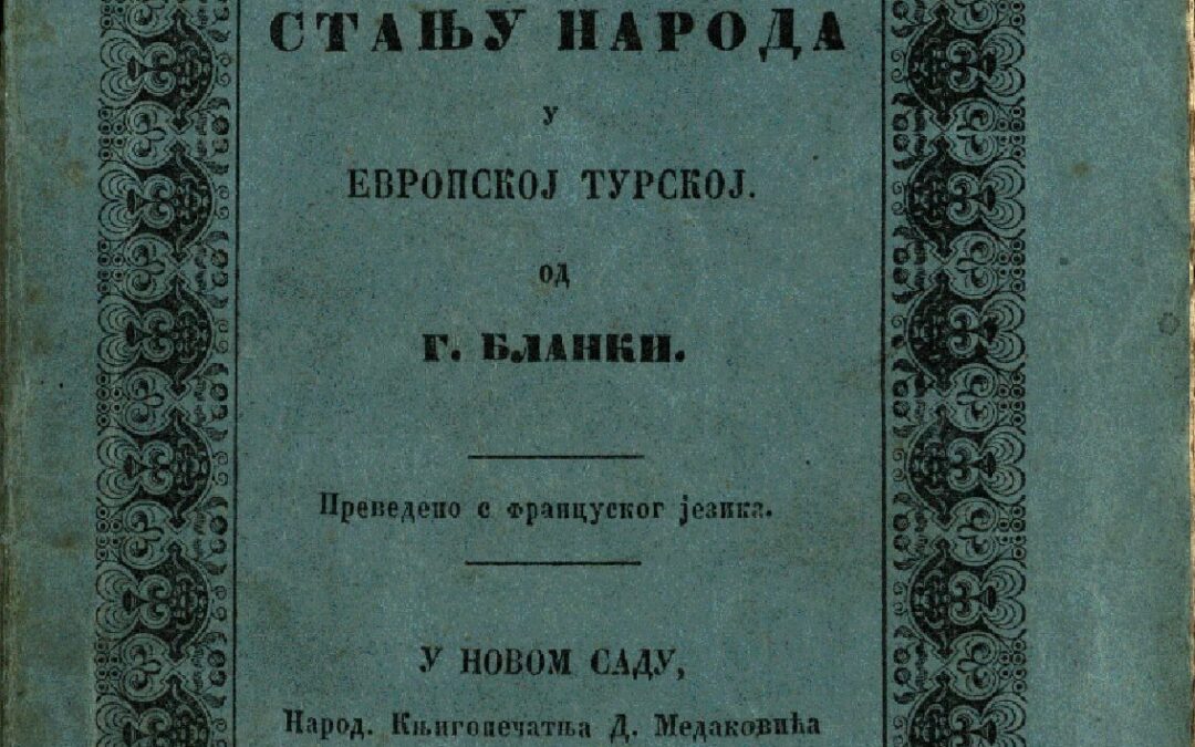 БЛАНКИ, Адолф Известие о стању народа у Европској Турској / од Г. Бланки, члана учене академие, профессора и управитеља школе трговачке ; Преведено с француског језика. - У Новом Саду : Нар. кнЬигопечатња Дан. Медаковића, 1850. - 75, [1] стр. ; 20 cm. Новаковић 1637; Кириловић 1438; КНБС 185; Српске штампане књиге БМС 1801-1867, 341. - Име преводиоца Винка Пацелића преузето са стр. 4. - "Читано у академији наука у Паризу." --> насл. стр.