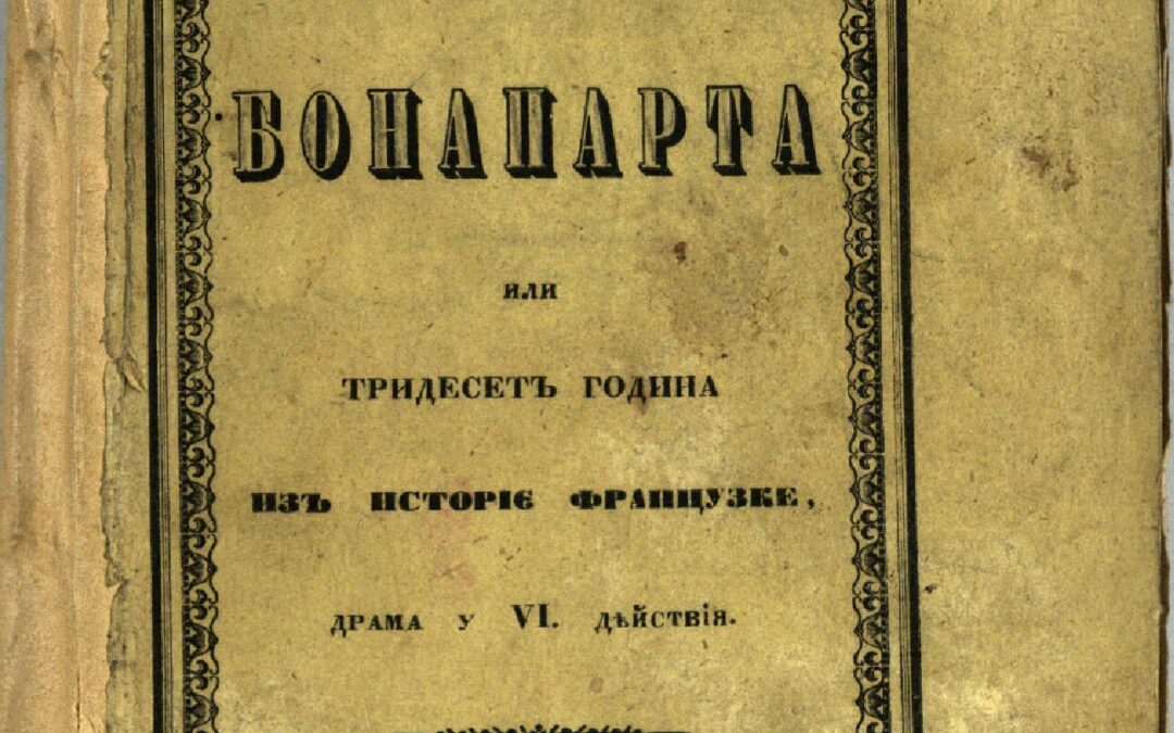 ДИМА, Александар НаполеонЪ Бонапарта или ТридесетЪ година изЪ исторіє Француске : драма у VI дěйства / одЪ А Дима ; сЪ францускогЪ превео ЛюбомирЪ П. НенадовићЪ. - У Београду : У КнЬигопечатнЬи Княжества СрбскогЪ, 1850. - [3], [X], [3], 178, [27] стр. ; 18 cm. Новаковић 1661; КНБС 589; Српске штампане књиге БМС 1801-1867, 1024. - ПредговорЪ и кратко обясненіє живота НаполеоновогЪ по реду година / Л.П. Н.: стр. I-X. - Списак пренумераната.