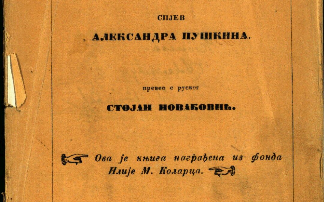 ПУШКИН, Александар Сергејевич Кавкаски роб / спјев Александра Пушкина ; превео с руског Стојан Новаковић. - У Биограду : У Државној штампарији, 1863. - [4], 35, [1] стр. ; 15 cm. Новаковић 2566; Кириловић 2279; КНБС 2250; Српске штампане књиге БМС 1801-1867, 3888. - "Ова је књига награђена из фонда Илије М. Коларца." --> насл. стр.