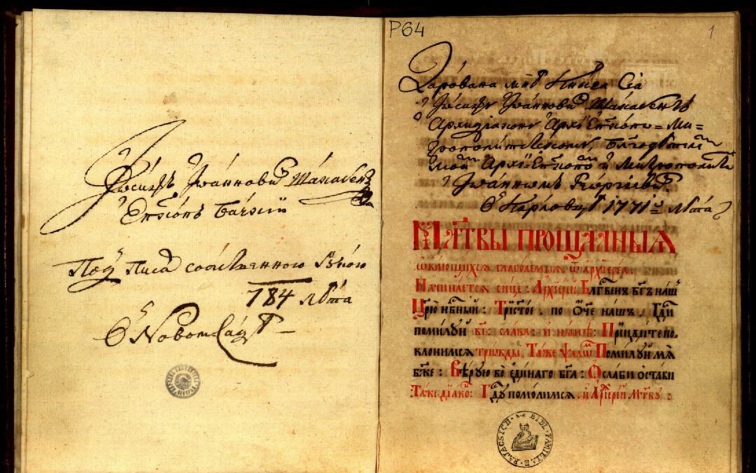 Архијерејски чиновник (1746)Писмо типографски полуустав и брзопис Један писар Иницијали Датирано према воденим знацима Повез: картон, кожа.Наслов: Архијерејски чиновникИздато: 1746 Збирка: НБС - Збирка ћирилских рукописних књигаБрој страна: 6Величина: 3 MBКликните да преузмете фајл: Архијерејски чиновник (1746)