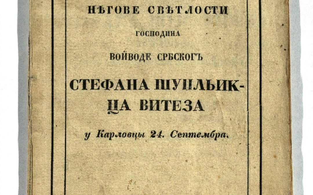 ЖИВКОВИЋ, Божидар СвечаностЬ, коіомЪ є народЪ србскій нěгову свěтлостЬ Господина Стефана ШуплЬикца витеза, избранаг свогЪ войводу, у Карловци 24. Сеп. т.г. дочекао / описао, у име србске младежи, БожидарЪ ЖивковићЪ. - У Карловцы : Брзотиск. народне печатнЬе Дан. Медаковића, 1848. - [2], VII, 32 стр. ; 18 cm. Новаковић 1532; Кириловић 1277; КНБС 697; Српске штампане књиге БМС 1801-1867, 1187. - Кор. ств. насл.: ДочекЪ нěгове свěтлости господина войводе србскогЪ Стефана ШуплЬикца витеза у Карловцы 24. Септембра