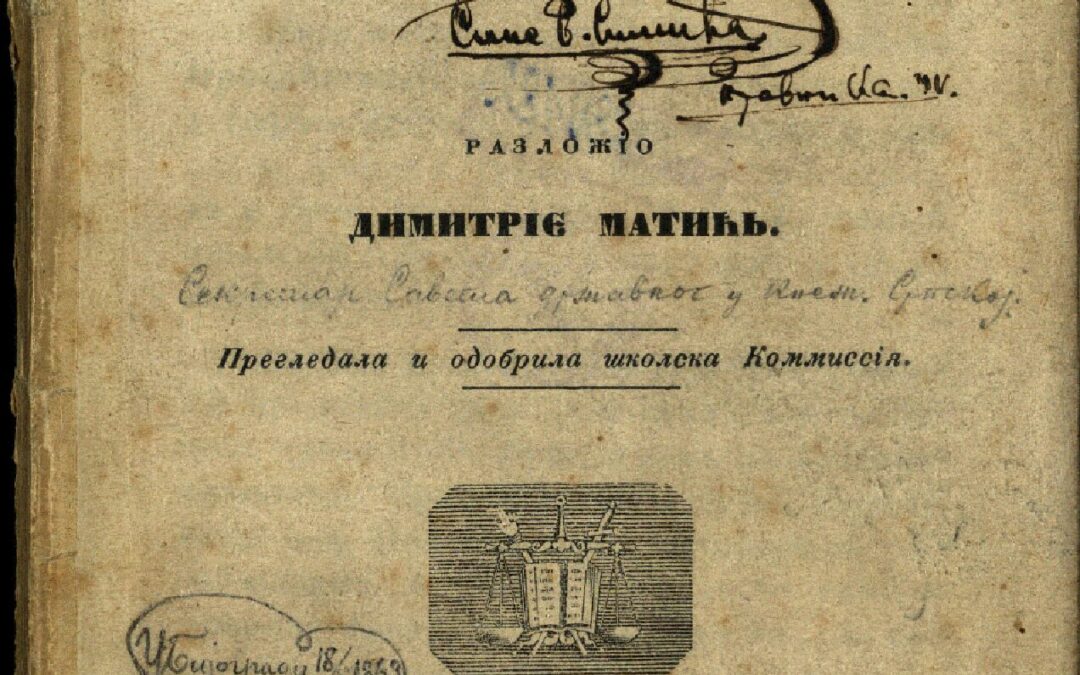 МАТИЋ, Димитрије Явно право Княжества Србіє / разложіо Димитріє Матићь. - У Београду : У Княжества Србскогъ Кньигопечатньи, 1851. - Стр. [1-2], I-VI [тј. IV] , I-II, 1-164 ; 22 cm. Кириловић 1529; КНБС 1434; Српске штампане књиге БМС 1801-1867, 2322. - "Прегледала и одобрила школска Коммиссія." --> насл. стр.