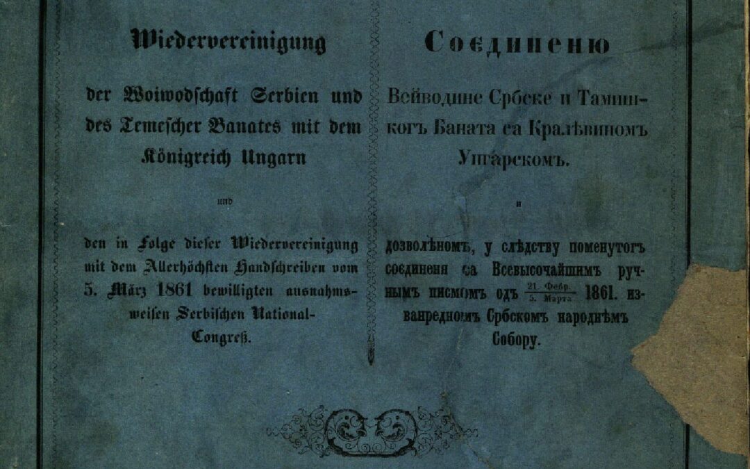 ДРЖАВНА писма о Соєдиненю Войводине Србске и Тамишкогъ Баната са Кралѣвиномъ Унгарскомъ и дозволѣномъ у слѣдству поменутогъ соєдиненя са Всевысочайшимъ ручнымъ писмомъ одъ 21. Фебр./5. Марта 1861. изванредномъ Србскомъ народнѣмъ Собору = Staatsschriften über die Wiedervereinigung der Woiwodschaft Serbien und des Temescher Banates mit dem Königreich Ungarn und den in Folge dieser Wiedervereinigung mit dem Allerhöchsten Handschreiben vom 5. März 1861 bewilligten ausnahmsweisen Serbischen National-Congreß. - У Карловцы : Типографіа Митрополітско-Гимназіална = Karlowitz : Druck der Metropolitan-Gymnasial-Bruchdruckerei, 1861. - 63, [10] стр. ; 30 cm. Новаковић 2345; Кириловић 2056; КНБС 629; Српске штампане књиге БМС 1801-1867, 1079. - Штампано двостубачно упоредо на нем. језику (гот.). - Приштампано: Додатакъ: Начинъ бираня посланика за изванредный Србский народный соборъ...