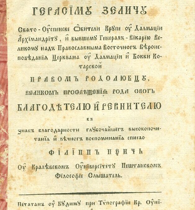 Енкомїастїкон° пречестнѣішемú и благоразúмнѣішемú господинú, господинú Герасїмú Зеличú, Свęто-Успенске Обители Крúпе у Далмацїи Архїмандрїтú, и бłвшемú Генерал°-Вїкарїю Великомú над° Православнłма Восточног° Вѣроисповеданїę Церквама у Далмацїи и Бокки Котарскоі правом родолюбцú, великом° просвѣштенїę рода свог° благодѣтелю и ревнителю - Филип Пејић (1826)