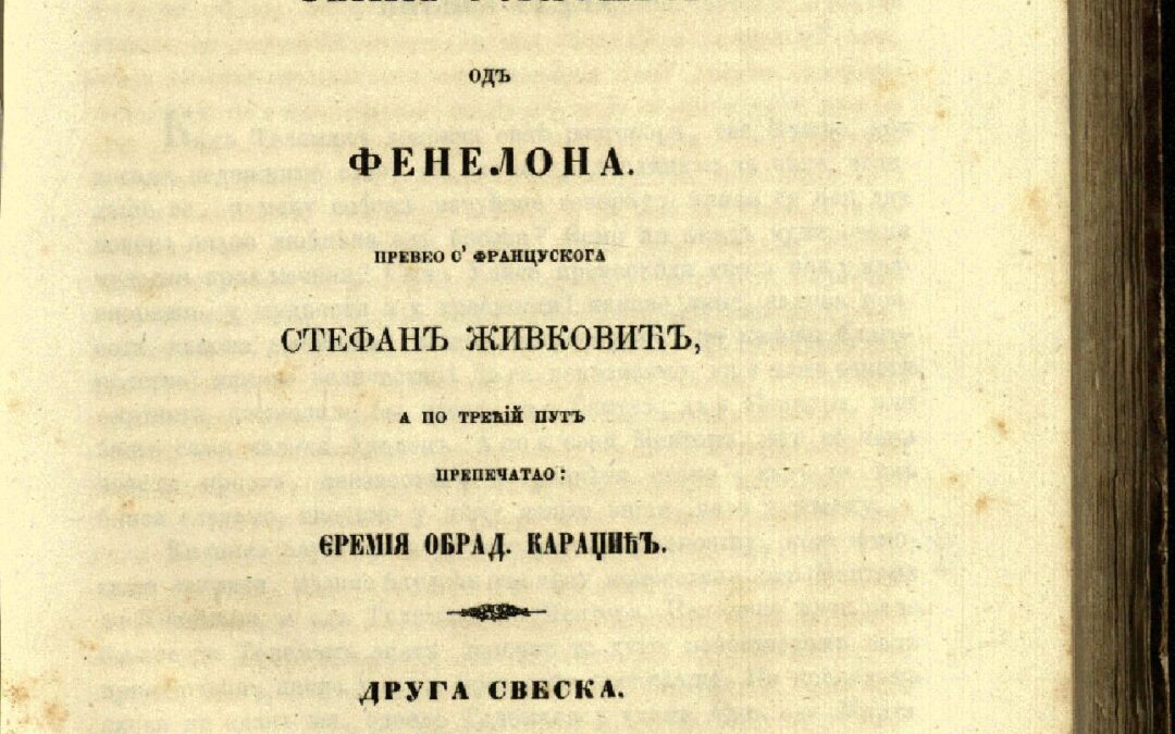 ФЕНЕЛОН, Франсоа де Салињак де ла Мот Приключеня Телемака сына Улисева. Св. 2 / одъ Фенелона ; превео с' францускога Стефанъ Живковићъ. - По трећій путъ препечатао Єремія Обрад. Караџићъ. - У Београду : У Штампаріи Николе Стефановића, 1865 [тј. 1868]. - Стр. 89-180 ; 22 cm. КНБС 2803; Српске штампане књиге БМС 1801-1867, 4810. - Тачна год. издавања дата према СБ 14580.