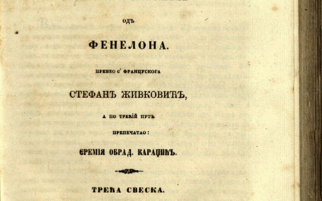 ФЕНЕЛОН, Франсоа де Салињак де ла Мот Приключеня Телемака сына Улисева. Св. 3 / одъ Фенелона ; превео с' францускога Стефанъ Живковићъ. - По трећій путъ препечатао Єремія Обрад. Караџићъ. - У Београду : У Штампаріи Николе Стефановића, 1865 [тј. 1868]. - Стр. 181-290 ; 22 cm. КНБС 2803; Српске штампане књиге БМС 1801-1867, 4811. - Тачна год. издавања дата према СБ 14580