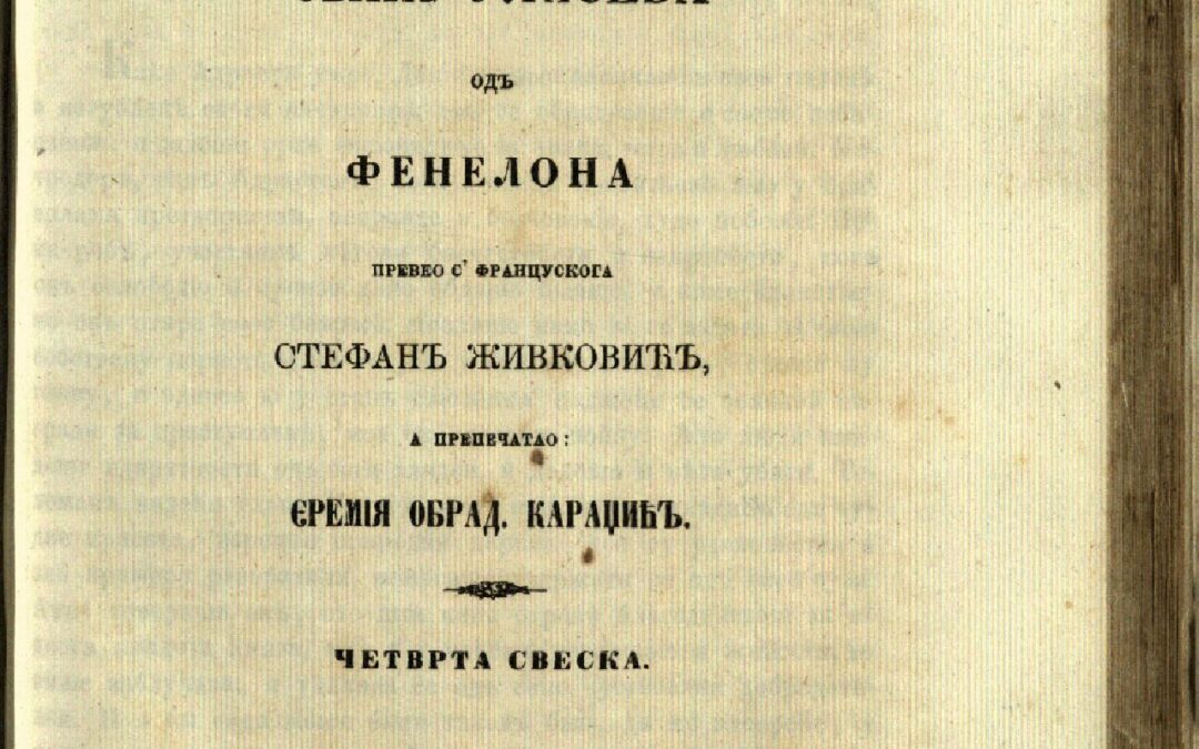 ФЕНЕЛОН, Франсоа де Салињак де ла Мот Приключеня Телемака сына Улисева. Св. 4 / одъ Фенелона ; превео с' францускога Стефанъ Живковићъ. - [По трећій путъ] препечатао Єремія Обрад. Караџићъ. - У Београду : У Штампаріи Николе Стефановића, 1865 [тј. 1868]. - Стр. 293-398 ; 22 cm. КНБС 2803; Српске штампане књиге БМС 1801-1867, 4812. - Тачна год. издавања дата према СБ 14580. - Према истом извору дат је и податак о издању