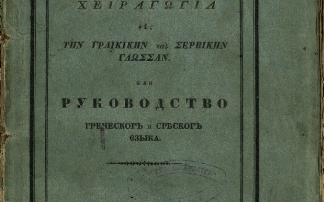 КИРИДИС, Георгије Руководство къ брзомъ и лакомъ наученю греческогъ и србскогъ єзыка / одъ Георгія Киридиса и Євтимія Авраамовића. - У Београду : при Правительственой Кньигопечатньи, 1845. - [3], 136, [17] стр. ; 22 cm. Новаковић 1362; Кириловић 1132; КНБС 1160; Панковић 1220; Српске штампане књиге БМС 1801-1867, 1920. - Упор. насл. стр. на грч. језику. - Списак пренумераната