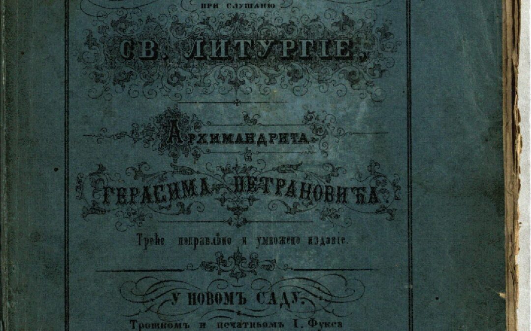 ПЕТРАНОВИЋ, Герасим Побожна размишляня при слушаню св. литургіе Архимандрита Герасима Петрановића. - Треће поправлěно и умножено изданіе. - У НовомЪ Саду : ТрошкомЪ и печатнЬомЪ І. Фукса, 1862. - [2], 150 стр., [5] листова с илустр. ; 16 cm. Новаковић 2480; КНБС 1965; Српске штампане књиге БМС 1801-1867, 3419.