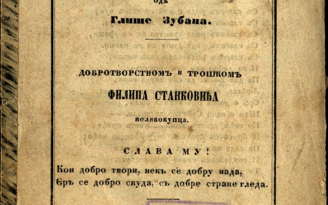 ЗУБАН, Глиша Гласъ народа, гласъ сына Божієгъ / одъ Глише Зубана. - У Београду : Кньигопечатньомъ Княжества Србскогъ, 1860. - 15 стр. ; 18 cm. Новаковић 2268; КНБС 835; Српске штампане књиге БМС 1801-1867, 1376. - "Добротворствомъ и трошкомъ Филипа Станковића великокупца. Слава му! Кои добро твори, некъ се добру нада, Єръ се добро свуда, съ добре стране гледа." --> насл. стр.