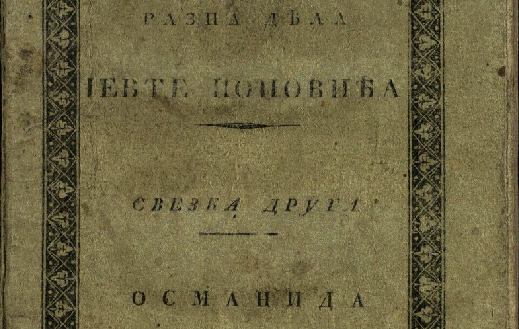 ПОПОВИЋ, Јевта Разна дѣла Іевте Поповића. Св. 2, [Османида Ивана Гундулића Дубровчанина спѣвана 1621 лѣта]. - У Будиму : Словима Краль. Университ. Пештанског, 1827. - 215, [1] стр. ; 20 cm. Новаковић 687; Кириловић 592; КНБС 2047; Панковић 665; Српске штампане књиге БМС 1801-1867, 3592. - "Verschiedene Werke Euphtym. Popovits." --> насл. стр. (гот.). - Гл. ств. насл. дат према КНБС, Панковићу и: Павел Јозеф Шафарик, Историја српске књижевности, Нови Сад 2004, стр. 280. - Ств. насл. преузет са задњих ориг. корица.