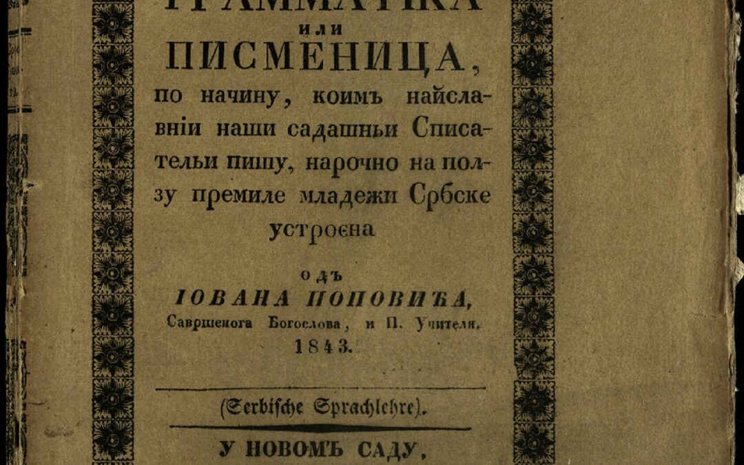 ПОПОВИЋ, Јован Србска грамматіка или Писменица : по начину, коимъ найславніи наши садашньи списательи пишу, нарочно на ползу премиле младежи Србске, устроєна / одъ Іована Поповића.... - У Новомъ Саду : Писмены Катаріне Іанковића Удове, 1843. - XIII, [3], 158, [9] стр. ; 21 cm. Новаковић 1267; Кириловић 1055; КНБС 2051; Панковић 1133; Српске књиге БМС 1801-1867, 3609. - "(Die serbische Sprachlehre)." --> насл. стр. (гот.). - Списак пренумераната.