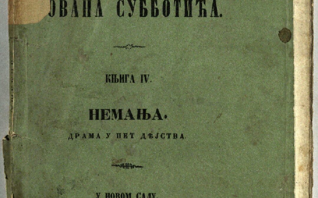 СУБОТИЋ, Јован Дěла Јована Субботића. Књ. 4, Пěсне драмске. [2, Немања]. - У Новом Саду : Епископска типографија, 1863. - Стр. [1], 200-365, [1] ; 16 cm. Новаковић 2604; Кириловић 2298; КНБС 2623; Српске штампане књиге БМС 1801-1867, 4590. - Друга нумерација тома и наслов преузети са стр. [201].