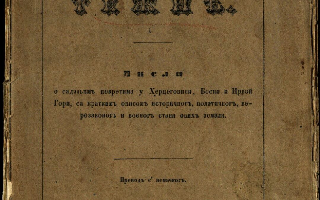 ЮГОСЛАВЕНСКЕ тежнѣ : Мисли о саданьимъ покретима у Херцеговини, Босни и Црной Гори, са краткимъ описомъ историчногъ, политичногъ, друштвеногъ, верозаконогъ и воєногъ станя овихъ земаля / Преводъ съ немачкогъ. - Друго изданѣ. - У Земуну : Печатао и издао І.К. Сопронь, 1861. - 28 стр. ; 22 cm. Кириловић 2137; КНБС 1031; Српске штампане књиге БМС 1801-1867, 5202.