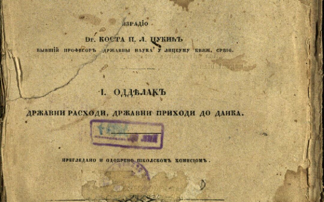 ЦУКИЋ, Коста Државне економіє. ЧастЬ 3, Финансія. Одд. 1, Државни расходи, државни приходи до данка / израдіо Dr. Коста П. Л. ЦукићЪ.... - У Бěограду : У К.С. правит. печатнЬи, 1853. - VI, [2], 256 стр. ; 21 cm. Новаковић 1875; КНБС 2894; Српске штампане књиге БМС 1801-1867, 4964. - "Прегледано и одобрено школскомЪ комисіомЪ" --> насл. стр.