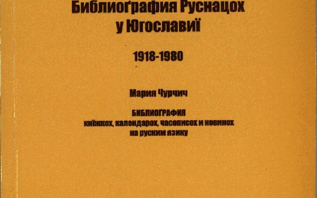 ЧУРЧИЋ, Марија Библиоґрафия Руснацох у Югославиї : 1918-1980. [Кн.] 1, Библиоґрафия кнїжкох, календарох, часописох и новинох на руским язику / Мария Чурчич. - Нови Сад : Библиотека Матици сербскей, 2006 (Нови Сад : Футура публикације). - LXVI, 1016 б. ; 24 cm. - (Библиографије Војводине = Библиоґрафиї Войводини) ISBN 86-800061-39-5 (брош.)