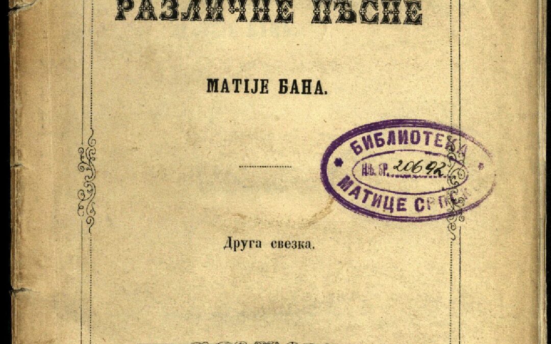 БАН, Матија Различне пјесне Матіје Бана. Св. 2. - У Београду : КнЬигопечатнЬомЪ Александра Андрића, 1861. - [8], 64 стр. ; 20 cm Новаковић 2330; Кириловић 2040; КНБС 132; Српске штампане књиге БМС 1801-1867, 212.