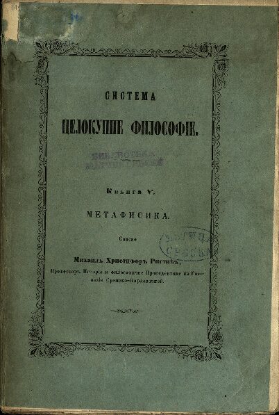 РИСТИЋ, Михаило Христифор Система целокупне философіе. Кнь. 5, Метафисика / списао Михаилъ Хр. Ристићъ.... - У Карловцы : Митрополітско-Гимназіална Типографіа, 1860. - 144 стр. ; 24 cm. Кириловић 2015; КНБС 2374; Српске штампане књиге БМС 1801-1867, 4086. - "Цѣна дућанска: 1 ф. Аутр. вр." --> задње корице.