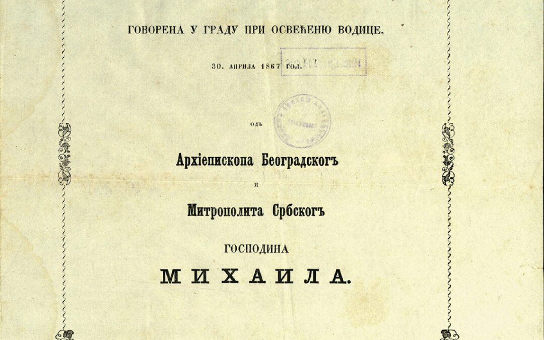 ЈОВАНОВИЋ, Михаило Беседа, говорена у граду при освећеню водице, 30. априла 1867 год. / одЪ Архіепископа БеоградскогЪ и Митрополита СрбскогЪ господина Михаила. - У Београду : Печатня А. Андрића, [1867]. - [4] стр. ; 25 cm. Новаковић 3102; Српске штампане књиге БМС 1801-1867, 1629.