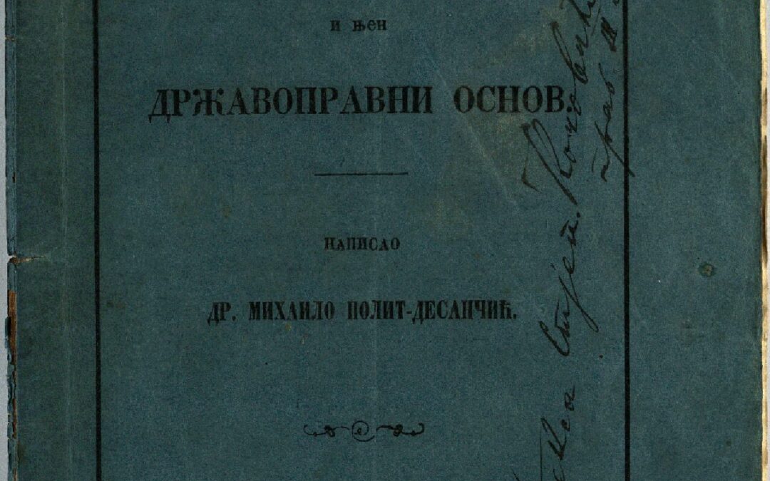 ПОЛИТ-Десанчић, Михаило Народност и њен државоправни основ / написао др. Михаило Полит-Десанчић. - У Новом Саду : Печатња Игњата Фукса, 1862. - [6], 44 стр. ; 21 cm. Новаковић 2431; Кириловић 2184; КНБС 2017; Српске штампане књиге БМС 1801-1867, 3532.