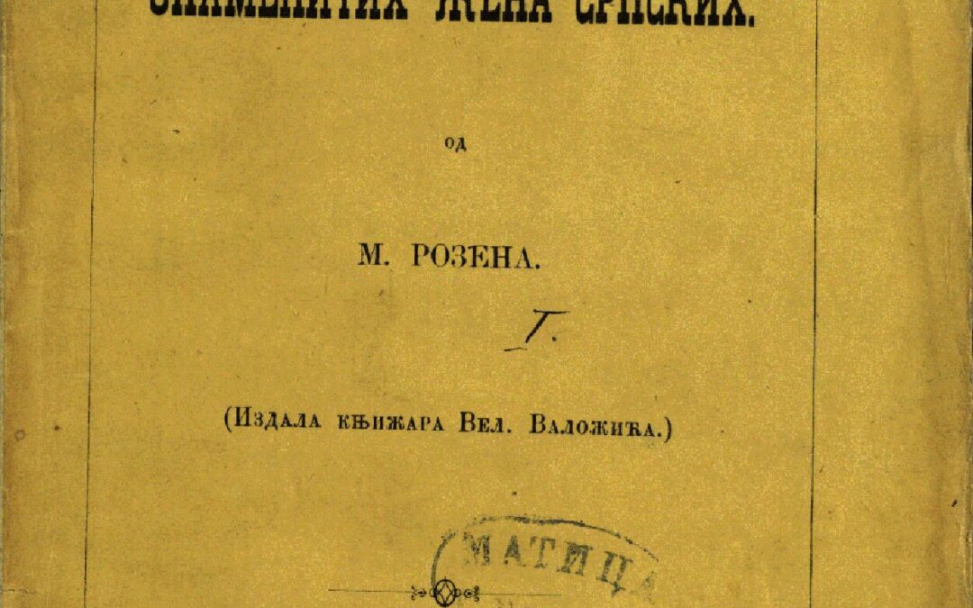 РОЗЕН, Михаило Галерија знаменитих жена српских. [1, Кнегиња Љубица Обреновићка] / од М. Розена. - [Београд] : Издала књижара Вел. Валожића, 1866 (У Београду : у Државној штампарији). - [4], 15 стр. ; 19 cm. Новаковић 2995; Кириловић 2595; КНБС 2385: Српске штампане књиге БМС 1801-1867, 4112. - Ств. насл. и нумерација тома преузети са стр. 2