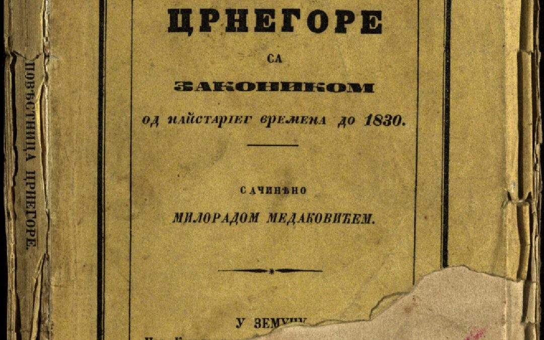 МЕДАКОВИЋ, Милорад Повѣстница Црнегоре од найстаріег времена до 1830. / сачинѣно Милорадом Медаковићем. - У Земуну : Кньигопечатньом Дра Дан. Медаковића, 1850. - 235, [1] стр., [1] пресавијен лист с портретом Петра Петровића Његоша ; 22 cm. Новаковић 1657; Кириловић 1459; КНБС 1447; Српске штампане књиге БМС 1801-1867, 2365.