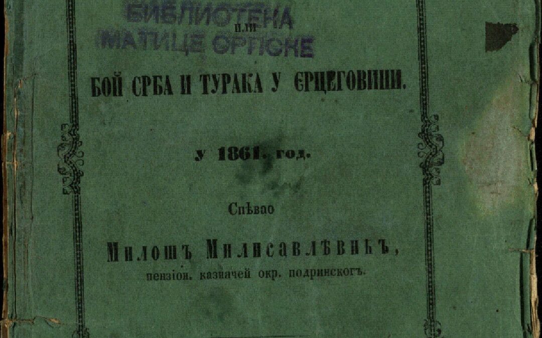 МИЛИСАВЉЕВИЋ, Милош Гусле Милошеве или Бой Срба и Турака у Єрцеговини 1861. год. Частъ 1 / Спѣвао Милошъ Милисавлѣвићъ.... - У Панчеву : Печатано у Штампарій А. Сибенхара, 1862. - 90 стр. ; 20 cm. Новаковић 2458; Кириловић 2170; КНБС 1486; Српске штампане књиге БМС 1801-1867, 2447. - Списак пренумераната.