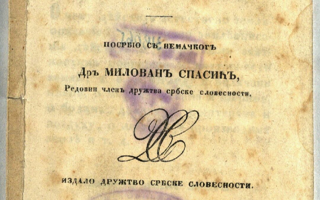 СПАСИЋ, Милован Єстествено землěописаніє за младежЬ / посрбіо сЪ немачкогЪ ДрЪ МилованЪ СпасићЪ.... - [Београд] : издало Дружтво србске словесности, 1850 (У Београду : Писменима КнЬигопечатнě Кнеж. Срб.). - [2], 36 стр. ; 15 cm. Новаковић 1696; КНБС 2517, Српске штампане књиге БМС 1801-1867, 4341