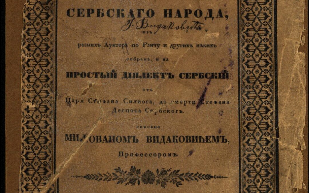 ВИДАКОВИЋ, Милован Исторіа славено-сербскаго народа. ЧастЬ 2 / изЪ разныхЪ Ауктора по Раичу и другихЪ нěкихЪ собрана, и на простый діалектЪ сербскій отЪ Царя Стефана Силнаго до смерти Стефана Деспота Сербскаго, списана МилованомЪ ВидаковичемЪ, ПрофессоромЪ. - У Бěограду : У Княжеско-Србской Типографіи, 1835. - [2], IV, 169 стр. ; 22 cm. Новаковић 923; Кириловић 714 и 765; КНБС 316; Панковић 770 и 839; Српске штампане књиге БМС 1801-1867, 530.