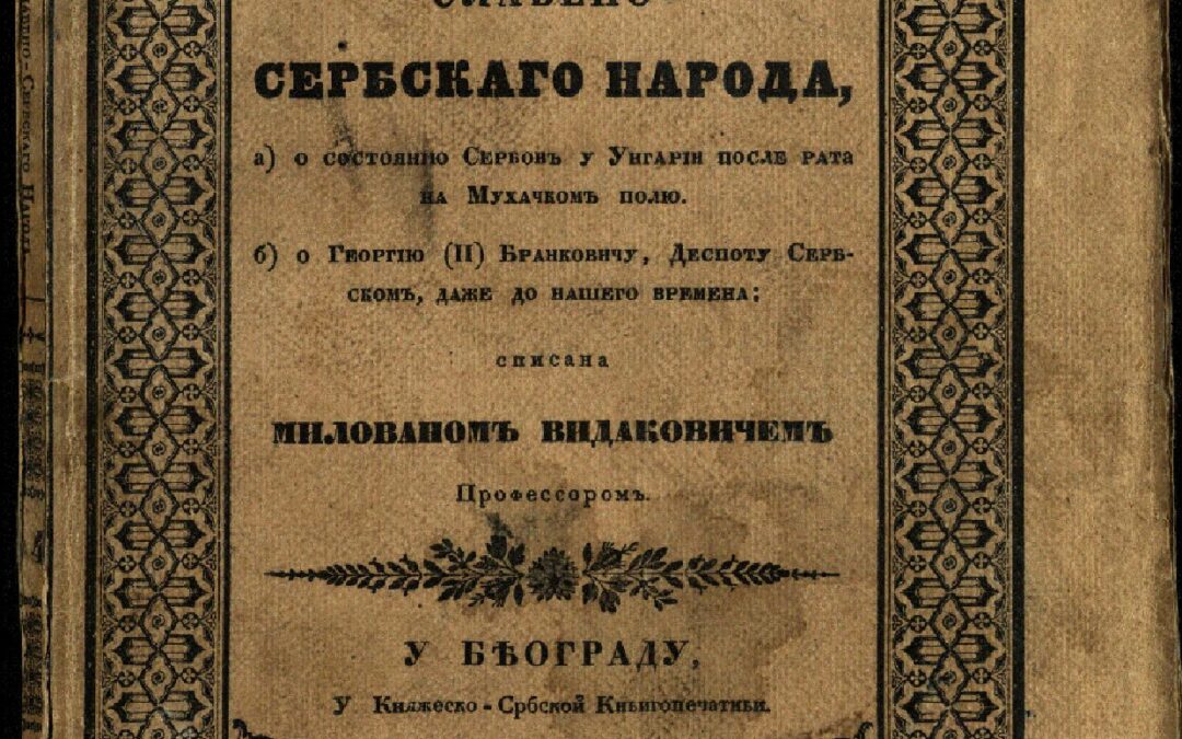 ВИДАКОВИЋ, Милован Исторіа славено-сербскаго народа. ЧастЬ 4 / списана МилованомЪ ВидаковичемЪ ПрофессоромЪ. - У Бěограду : У Княжеско-Србской КнЬигопечатнЬи, 1837. - VI, 195 стр. ; 23 cm. Новаковић 982; Кириловић 714 и 805; КНБС 316; Панковић 770 и 900; Српске штампане књиге БМС 1801-1867, 536.