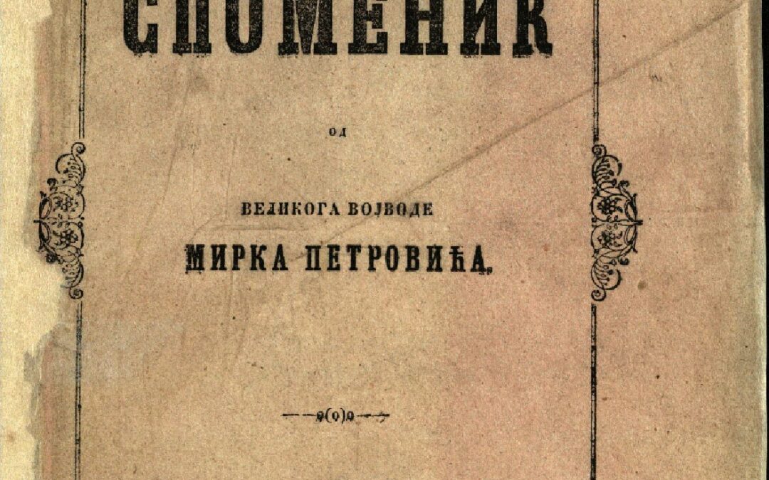 ПЕТРОВИЋ, Мирко Јуначки споменик : пјесне о најновијим турско-црногорским бојевима спјеване од великога војводе Мирка Петровића / Издао [и приредио] Архимандрит цетињски Нићифор Дучић. - На Цетињу, 1864 (у књажеској штампарији). - [10], 221, [1] стр. ; 20 cm. Новаковић 2694; Кириловић 2364; КНБС 1981; Српске штампане књиге БМС 1801-1867, 3480