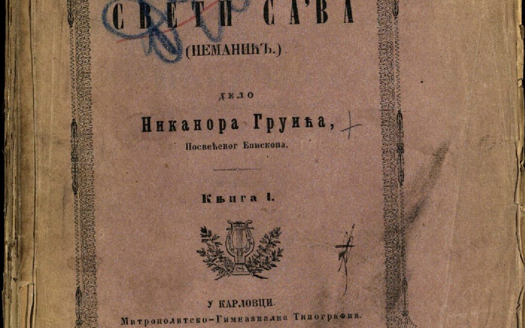 ГРУЈИЋ, Никанор Свети Са'ва (НеманићЪ). Књ. 1 / дело Никанора Груића, Посвећеног Епископа. - У Карловци : Митрополитско-Гимназиална Типография, 1861. - [6], 201, [1] стр. ; 21 cm. Новаковић 2342; Кириловић 2059; КНБС 499; Српске штампане књиге БМС 1801-1867, 864.