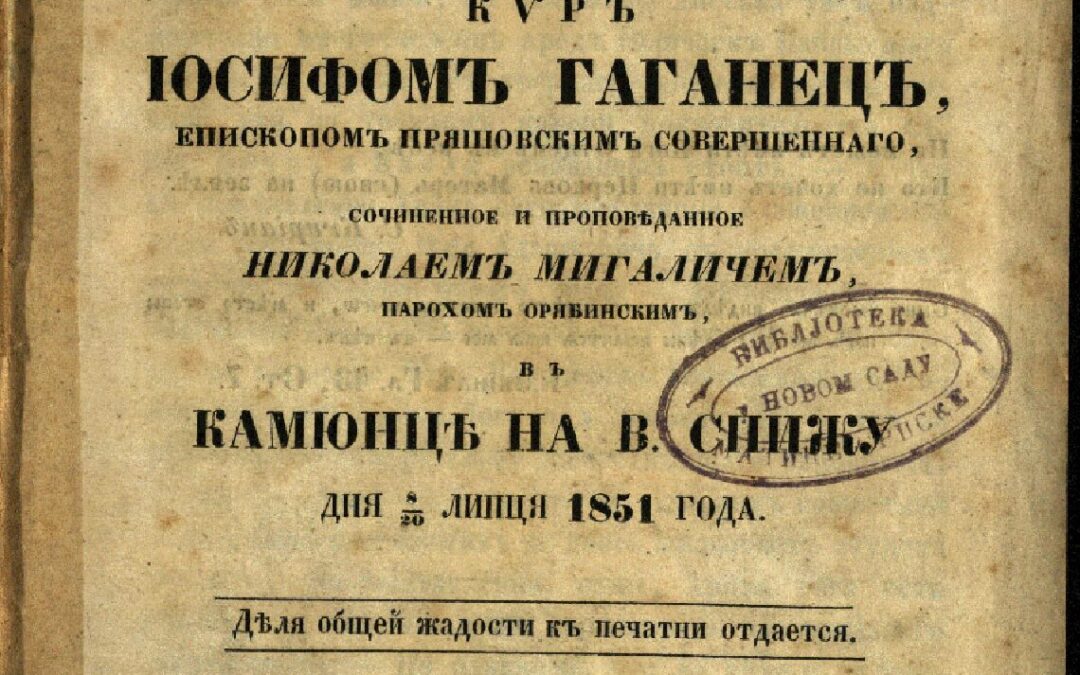 МИГАЛИЋ, Никола Слово церковное при прилежитости торжественнаго посвященія ново устроеннаго храма божаго его преосвященствомъ высокопочтеннěйшимъ архи-іереемъ Кѵръ Іосифомъ Гаганецъ, епископомъ пряшовскимъ совершеннаго / сочиненное и проповѣданное Николаемъ Мигаличемъ. - ВЪ Вѣдни : типомъ О.О. Мехитаристовъ, 1852. - 16 стр. ; 22 cm. Привезано уз: Говор којег је држао Лазар Поповић приликом освећења ново извајане и обновљене цркве у Осеку на Велику Госпојину: Поп. II 205/Пв: БМСНС. - Печат: Петар Попадић (насл. и задња стр.).: Поп. II 205/Пв: БМСНС