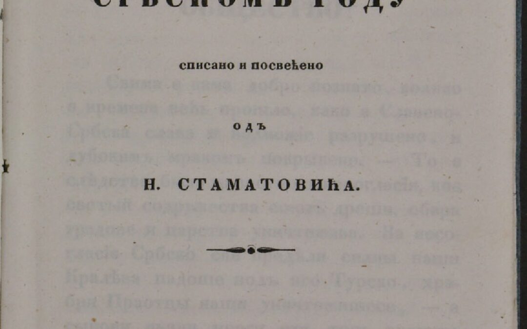 СТАМАТОВИЋ, Никола СрбскомЪ роду / списано и посвећено одЪ Н. Стаматовића. - [У Београду : У Княжеско-Србской ПечатнЬи, 1844]. - [2], VI, 14 стр. Кириловић 1110; КНБС 2560; Српске штампане књиге БМС 1801-1867, 4411. - Место и година издавања дати према наведеним изворима