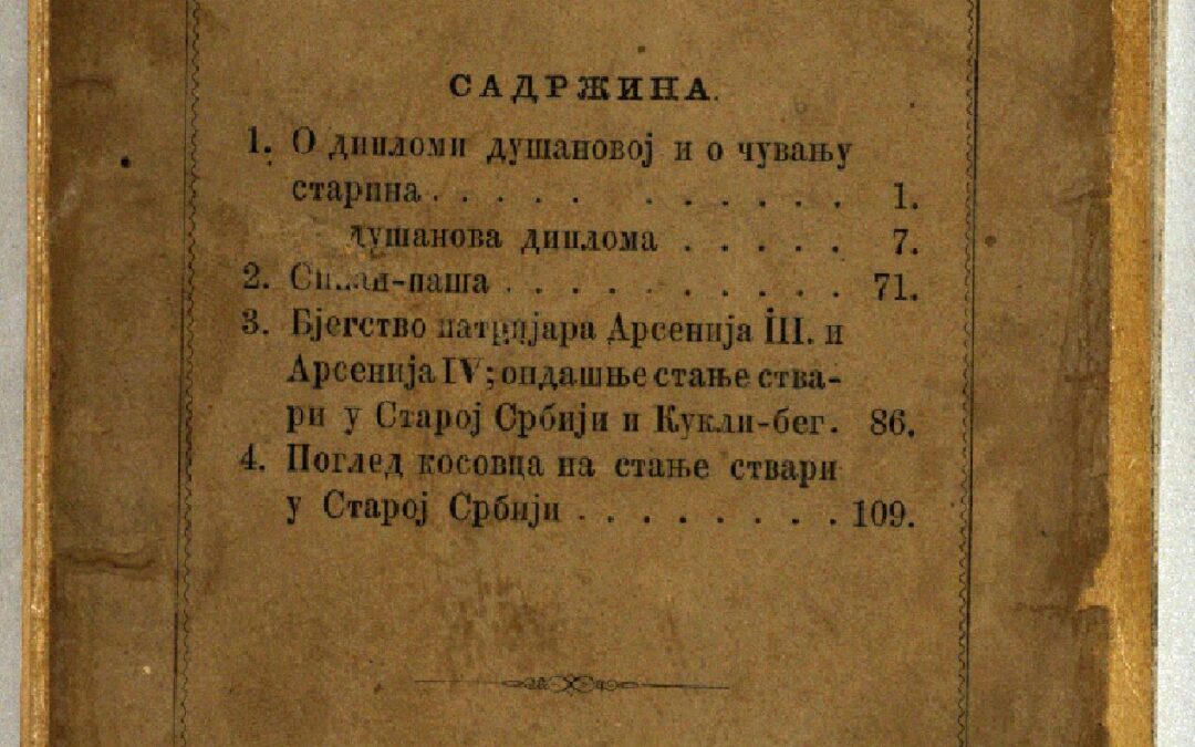 СРЕЋКОВИЋ, Пантелија Синан-паша / написао П. Срећковић. - [Призрен] : Трошком г. Симе Андрејевића Игуменова, 1865 (Биоград : Државна штампарија). - [10], 125, [22] стр. ; 17 cm. Новаковић 2839; Кириловић 2503; КНБС 2540; Српске штампане књиге БМС 1801-1867, 4394. - Део текста црквеном ћирилицом. - Списак пренумераната. - Садржај: 1. О дипломи Душановој и о чувању старина; Душанова диплома. 2. Синан-паша. 3. Бјегство патријара Арсенија III. и Арсенија IV.; ондашње стање ствари у Старој Србији и Кукли-бег. 4. Поглед Косовца на стање ствари у Старој Србији.