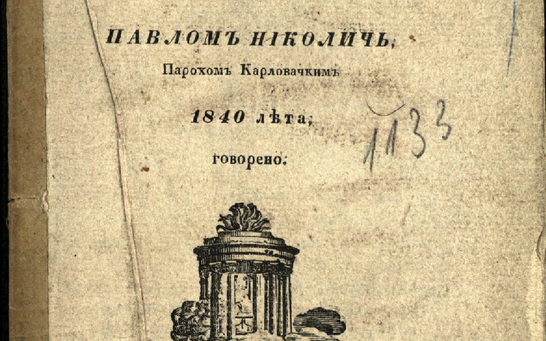 НИКОЛИЋ, Павле Слово на ново лěто / Павломъ Ніколичь, ПарохомЪ Карловачкимъ 1840 лѣта, говорено. - У Новомъ- Саду : Писменима Паýла Іанковића, Ц.К. прів. Тýпографа, 1840. - 22, [1] стр. ; 19 cm. Новаковић 1133; КНБС 1748; Српске штампане књиге БМС 1801-1867, 2982.