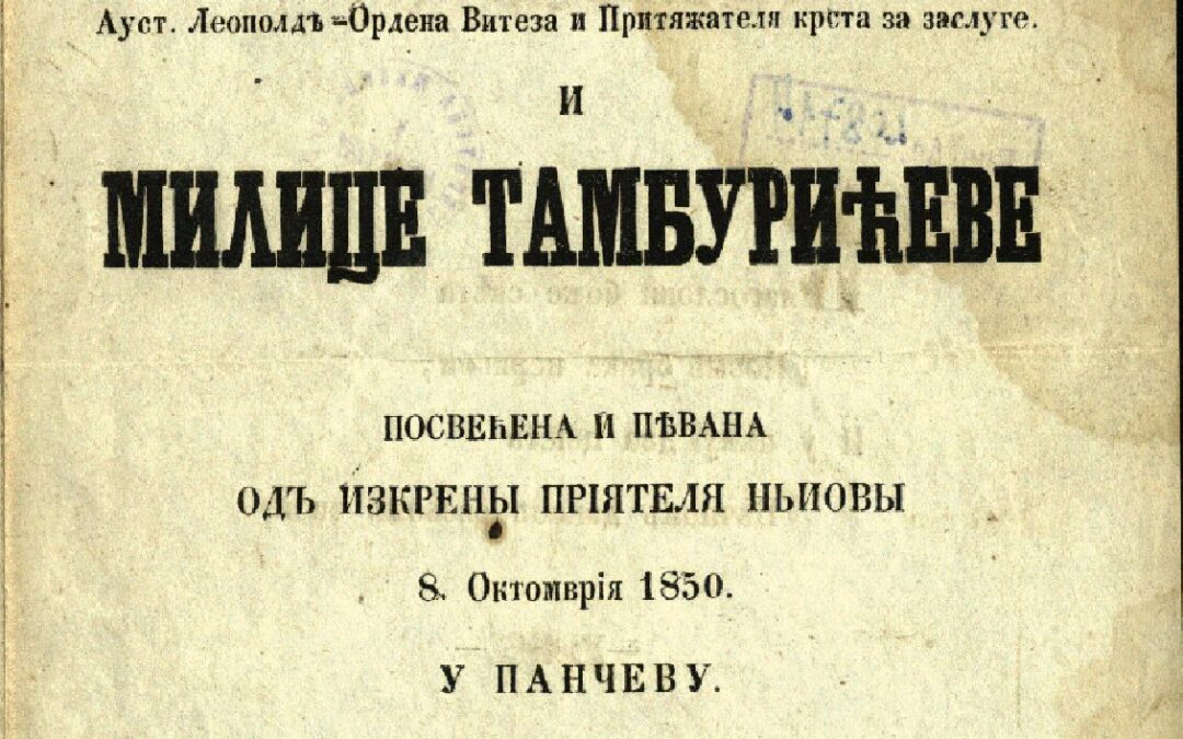 ПѢСМА на данъ вѣнчаный младога юнака, Србина Іована Стефановића ц. к. капетана Ауст. Леополдъ-Ордена Витеза и Притяжателя крста за заслуге и Милице Тамбурићеве : посвећена и пѣвана одъ изкрены пріятеля нЬиовы 8. Октомврія 1850. у Панчеву. - [Панчево] : Писмены Іов. Каулициія, ц.к. Типографа, 1850. - [4] стр. ; 20 cm. Српске штампане књиге БМС 1801-1867, 3891.