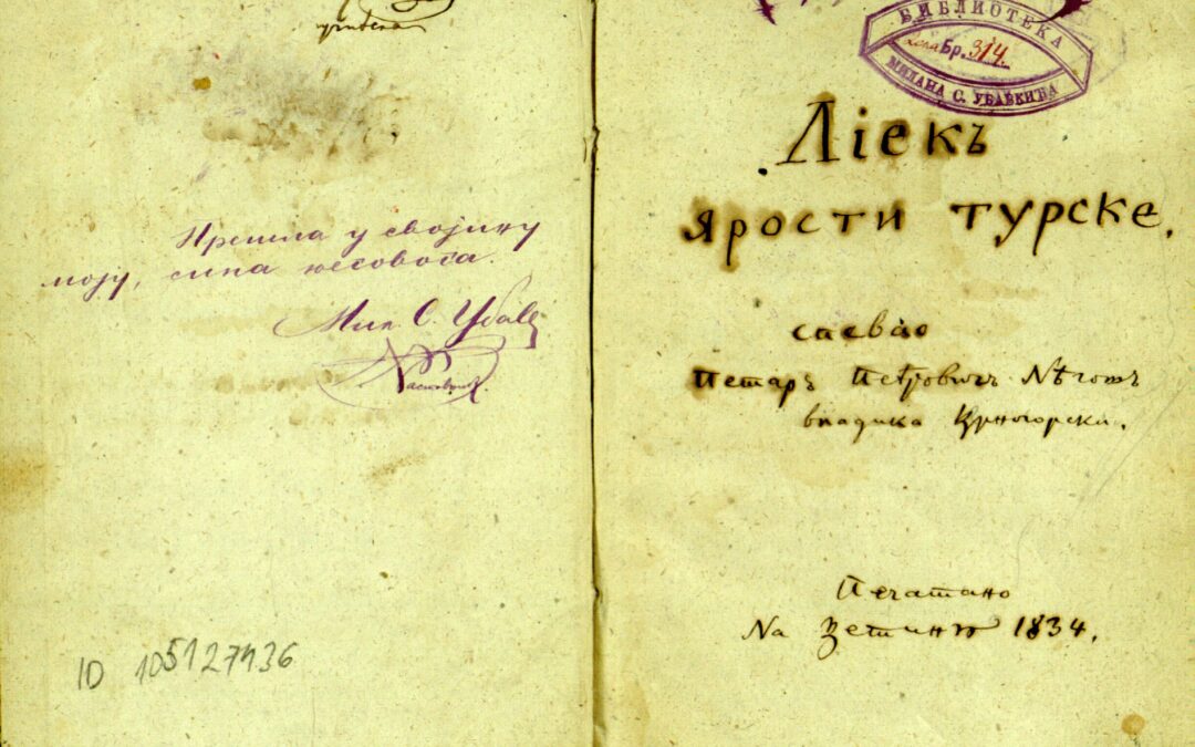 Лијек јарости турске - Петар II Петровић Његош (1834)Пѣсна за Вида и Мирчету како су скупили чету и узели топ с Пужа: стр. 1-7 ; Ударац на Мартиниће 1832 года 23 Априла: стр. 9-17 ; Вук пріятель овчи: стр. 18-21 ; Нахіе: стр. 22-23;Наслов: Лијек јарости турске Аутор: Петар II Петровић ЊегошИздавач: Штампарија ЦрногорскаИздато: Цетиње, 1834 Збирка: НБС - Збирка књига Петра II Петровића ЊегошаБрој страна: 13Величина: 13 MBКликните да преузмете фајл: Лијек јарости турске - Петар II Петровић Његош (1834)