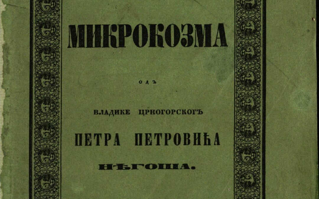 ПЕТРОВИЋ Његош, Петар Луча Микрокозма / одЪ владыке црногорскога Петра Петровића Нěгоша. - У Београду : Княжества србскога кнЬигопечатнЬомЪ, 1845. - 81 стр. ; 23 cm. Новаковић 1381; Кириловић 1143; КНБС 1798; Панковић 1261; Српске штампане књиге БМС 1801-1867, 3450. - На унут. стр. предњих корица стихови писани руком П. П. Његоша: Поете су поколěнě лудо Будалама кадЪ бы вěровали, В. ПетарЪ: БМСНС: Отовић ИИИ2