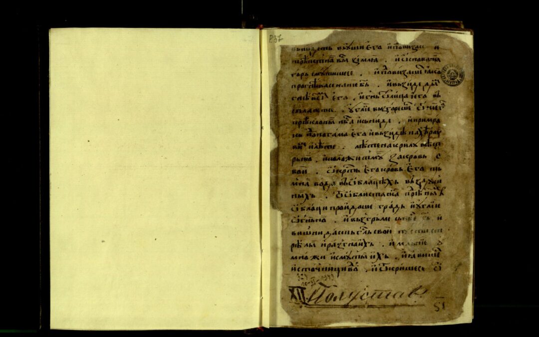 Писмо полууставно Један писар Заставица, иницијали Датирано према воденим знацима Повез: картон, кожа. Садржи и: У суботу светаго и праведнаго Лазара (скраћени Цветни Триод);
