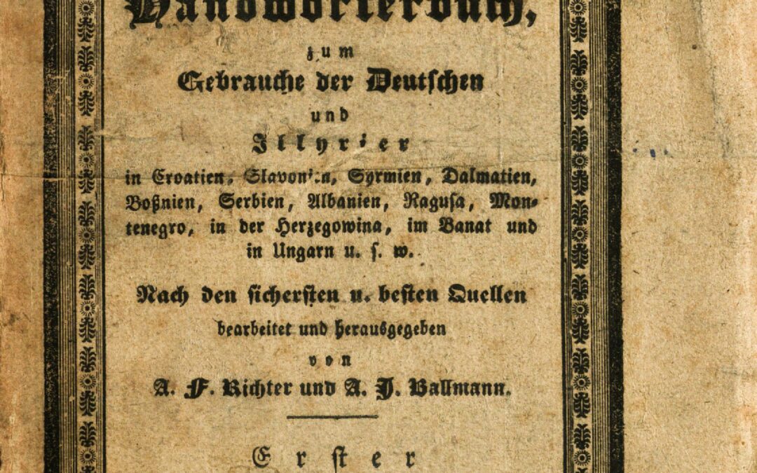 VESELIĆ, Radovan Ilirsko-nemacski i nemacsko-ilirski rukoslovnik. Dio 1, Ilirsko-nemacski : na korist Nemacah i Ilirah u Horvatskoj, Slavonii, Sremu, Dalmacii, Bosni, Serbii, Albanii, Dubrovniku, Cernoj Gori, u Hercegovini, Banatu, Ugarskoj i t. d. / polag najsigurniih i najboljih izvorah izdilan i izdan Adolfom Miroslavom Richterom i Adolfom Joz. Ballmannom. - U Becsu : kod Mihailja Lechnera, 1839. - [6], 370 str. ; 23 cm. Kukuljević 438; KNBS 303; Srpske štampane knjige BMS 1801-1867, 506. - Uporedna nasl. str. na nem. jeziku (got.). - Ballman Adolph Joseph je pseudonim Rudolfa Veselića.