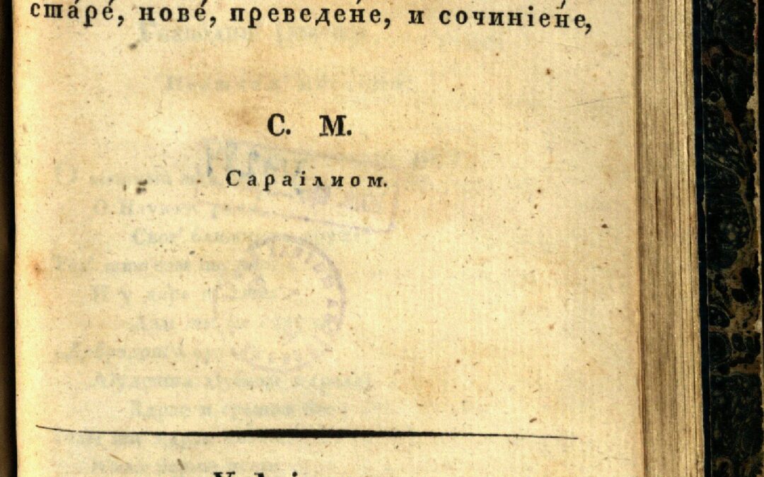 МИЛУТИНОВИЋ-Сарајлија, Сима Неколике піеснице : старе, нове, преведене и сочиніене С. М. Сараілиом. - У Лаіпцигу : у Кніигопечатніи Браіткопфа и Хертела, 1826. - 92 стр. ; 13 cm Новаковић 665; Кириловић 571; КНБС 1532; Панковић 645; Српске штампане књиге БМС 1801-1867, 2553.