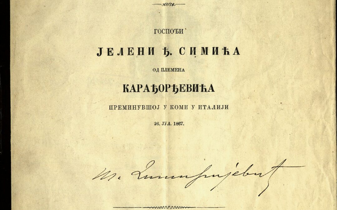 Спомен госпођи Јелени Ђ. Симића од племена Карађорђевића (1867)
