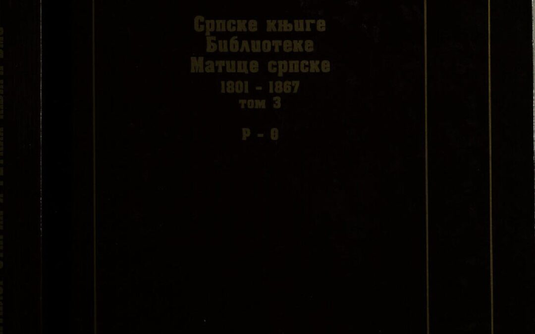 СРПСКЕ књиге Библиотеке Матице српске : 1801-1867. Том 3, Р-Ө / [редактори Финка Пјевач, Јасна Карталовић]. - Нови Сад : Библиотека Матице српске, 2007 (Нови Сад : Будућност). - VII, 380 стр., [16] стр. с таблама (факс.) ; 24 cm. - (Каталог старих и ретких књига Библиотеке Матице српске ; књ. 5) Тираж 600. - Стр. V-VII: Увод у Каталог / редактори. - Ауторски регистар: стр. 349-353 ; Регистар наслова: стр. 354-367 ; Регистар издавача и штампара: 368-375 ; Хронолошки регистар: стр. 376-378 ; Стручни регистар: стр. 379-380.