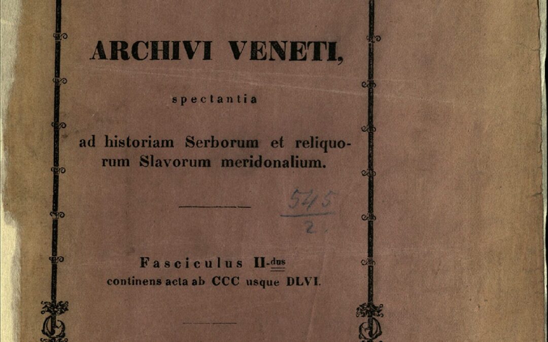 СРБСКИ споменици МлетачкогЪ Архива = Acta Archivi Veneti : spectantia ad historiam Serborum et reliquorum Slavorum meridionalium. Fasc. 2 : continens acta ab CCCI. usque DLVI. / Collegit et transcripsit Dr. Joannes Schafárik. - Belgradi : in Typographia Principatus Serbiae, 1862. - 622 стр., [1] пресавијен лист с факс. ; 23 cm. Кириловић 2215; КНБС 2974; Српске штампане књиге БМС 1801-1867, 4373. - Текст на срп. и лат. језику.