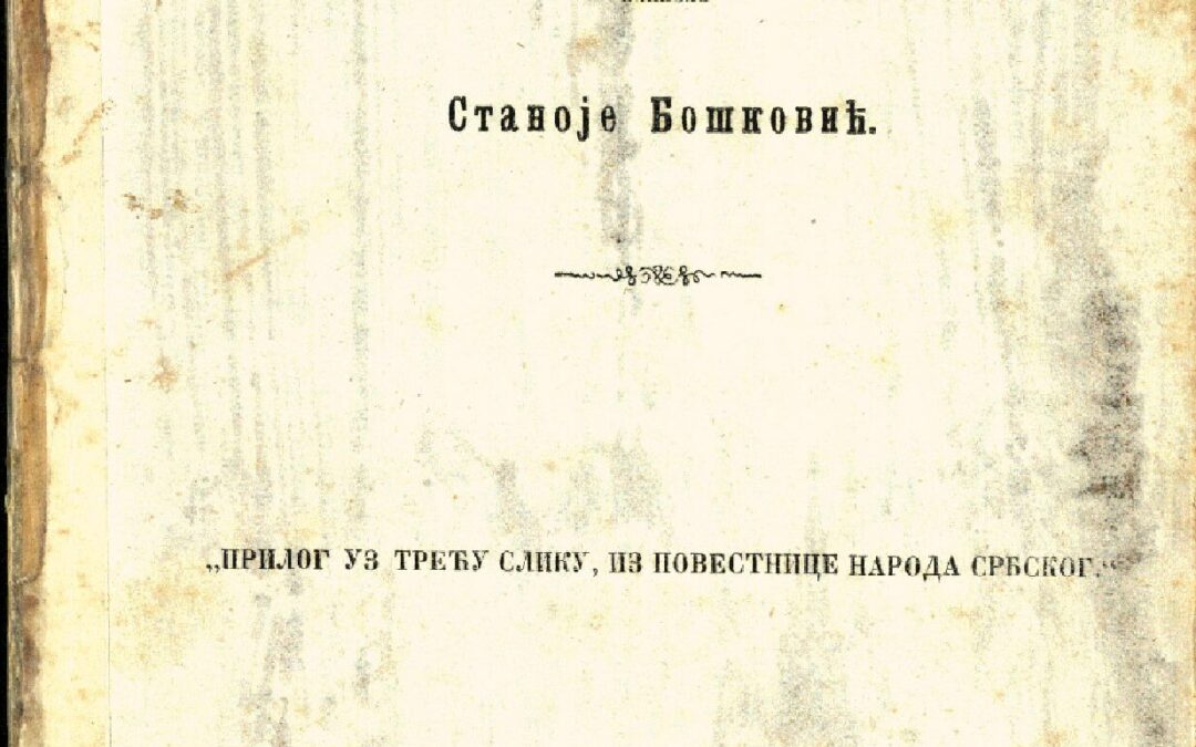 БОШКОВИЋ, Станоје Вечера кнежева : Прилог уз трећу слику из Повестнице народа србског / написао Станоје Бошковић. - У Новоме Саду : у печатњи епископској, 1861. - 26 стр. ; 20 cm. Новаковић 2335; КНБС 222; Српске штампане књиге БМС 1801-1867, 390. - Предговор / Павле Чортановић: стр. 3. - На полеђину насл. стр. залепљена илустрација.