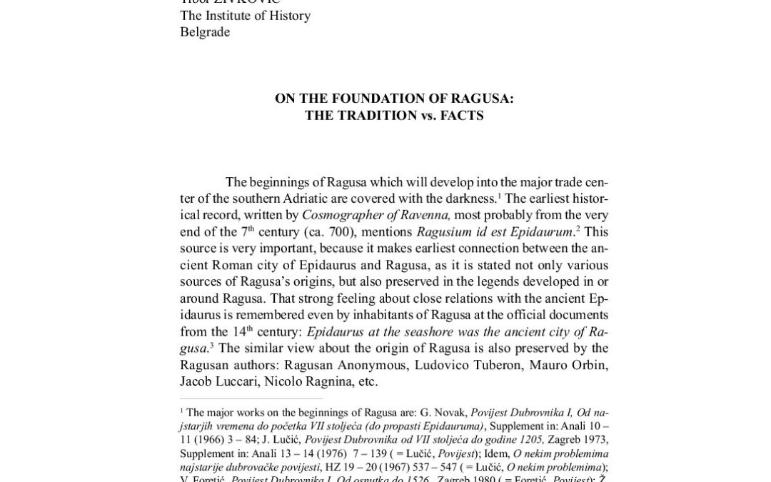 Ова студија анализира различите традиције и историјске чињенице о оснивању Дубровника, укључујући сведочанства византијског цара Константина Порфирогенита и археолошка открића из 1981. године, која указују на постојање насеља на месту данашњег Дубровника још од III века п.н.е.