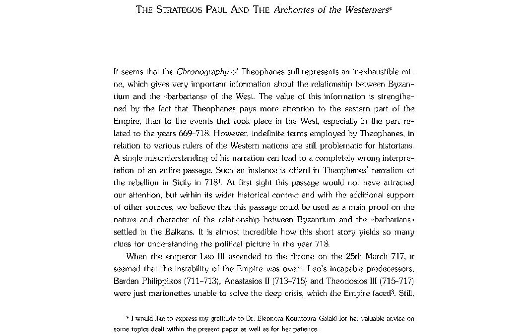 Ова студија анализира однос између Византије и западних 'варвара' током 8. века, фокусирајући се на улогу стратега Павла и архоната западних Словена. Аутор истражује како је Византија комуницирала и сарађивала са словенским поглаварима на Балкану, посебно у контексту побуне на Сицилији 718. године.
