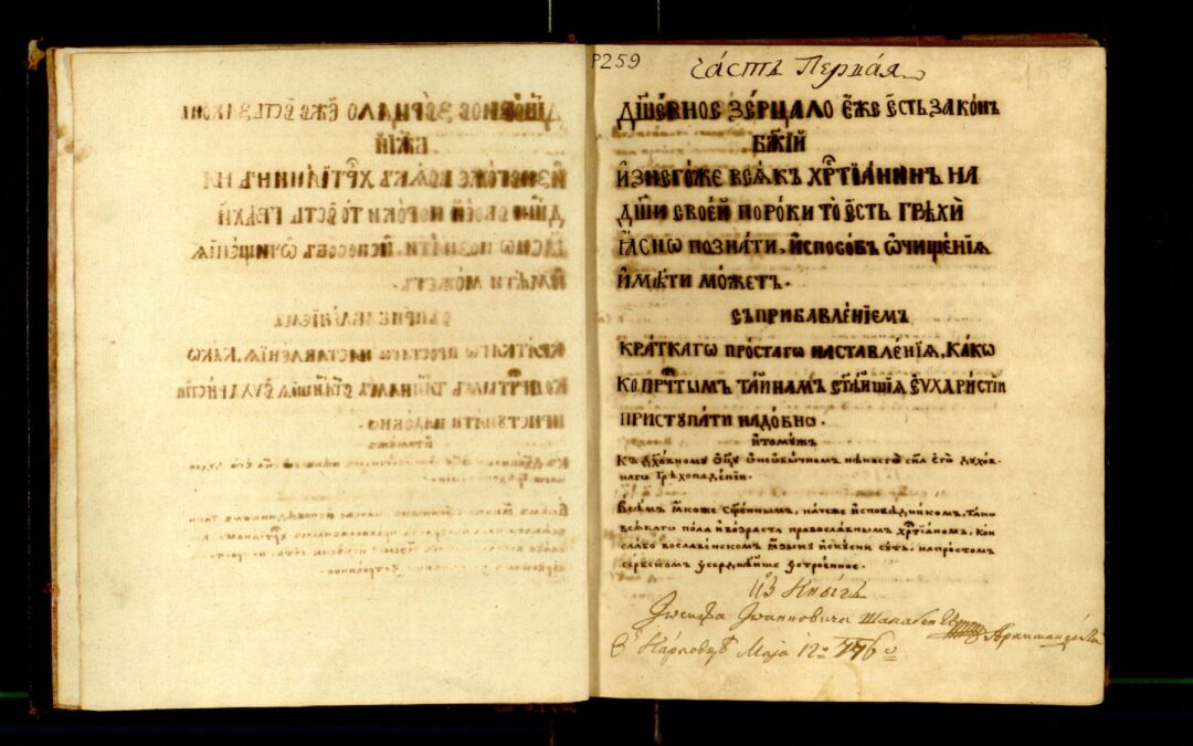 Писмо брзопис Један писар Датирано према запису писара Повез: картон, кожа. Садржи: Душевноје зерцало од Теофана Прокоповича; Исправленије грјешника од Јована Рајића;